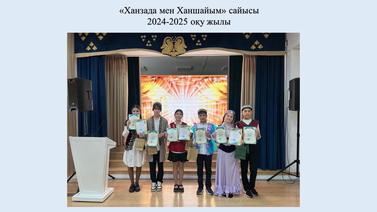 2024 жылдың 18 желтоқсан күні гимназияда 7-8 сыныптар аралығында «Ханшайым мен Ханзада» сайысы өткізілді. Бұл сайыс оқушылардың шығармашылық қабілеттерін көрсетуге, ұлттық мәдениетімізді насихаттауға және командалық жұмыс дағдыларын дамытуға бағытталған ерекше шара болды.